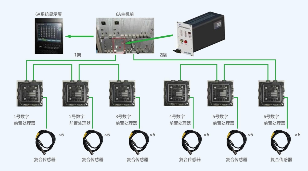 走行部故障監(jiān)測系統(tǒng)(型號YZD-2)是為保證車輛運(yùn)行安全與品質(zhì)、評估部件健康狀態(tài)而研制的在線實(shí)時(shí)監(jiān)測裝置。相比軸溫監(jiān)測系統(tǒng),該系統(tǒng)采用溫度、振動和沖擊監(jiān)測相結(jié)合的多參數(shù)診斷機(jī)制及專家系統(tǒng),可在故障早期發(fā)現(xiàn)部件異常,提高運(yùn)營安全性、及時(shí)檢修改善部件運(yùn)行環(huán)境、延長部件使用壽命、減少運(yùn)營成本。系統(tǒng)主要由車載主機(jī)、前置處理器及復(fù)合傳感器組成,整車結(jié)構(gòu)拓?fù)淙缦聢D示意。